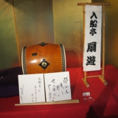 お茶の時間の舞台上。扇遊師匠と辰のこさんのサインを飾って。